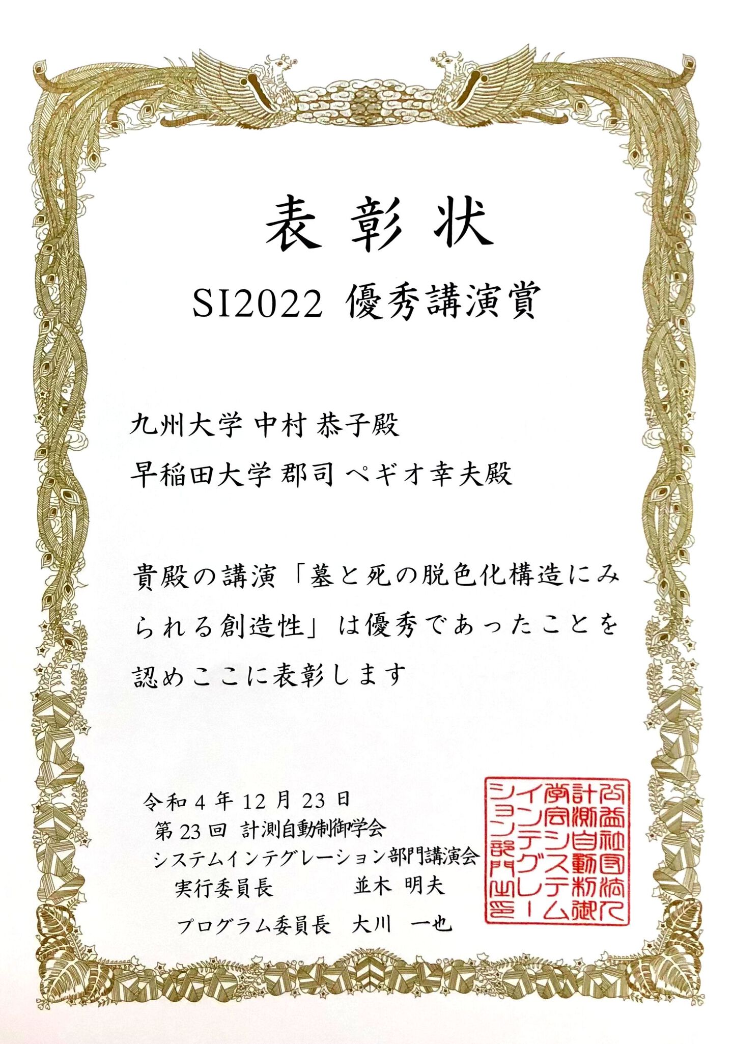 2022年12/14-16日程で開催された第23回計測自動制御学会システムインテグレーション部門講演会の発表が、優秀講演賞をいただきました。